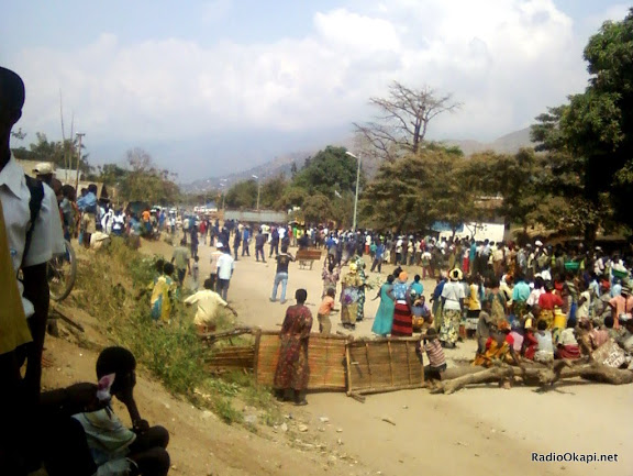 | Des commerçants de Kasenga (Uvira, Sud-Kivu) barricadant l’artére principale qui mène vers Bukavu et Bujumbura tôt ce matin (15/06/2011). Radio Okapi |