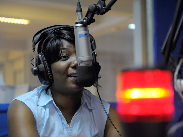 | Nicole Ngaka, rédactrice en Chef Adjoint de Radio Okapi en studio à Kinshasa |
