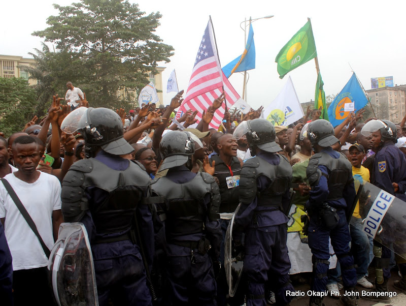 La police encadre les partisans de l’UDPS le 5/9/2011 à Kinshasa, lors du dépôt de