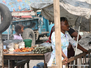 La chikwangue ou Kwanga (pain de manioc roui et moulé dans des feuilles puis cuit à l'eau), sur un étalage dans un marché municipal de Kinshasa. Ph. Myriam Asmani/Monusco, 2006.