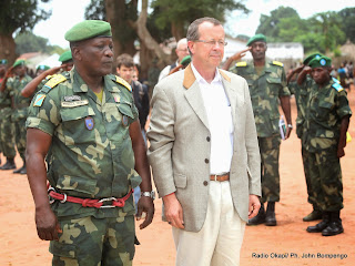 De gauche à droite, le colonel Mbienga Mwanakoko Kilolo commandant du centre d’entrainement commando de Kotakoli et le représentant spécial du secrétaire général de l’Onu pour la RDC, Martin Köbler, lors d’une visite de travail le 11/09/2014 dans la province de l’Equateur. Radio Okapi/Ph. John Bompengo