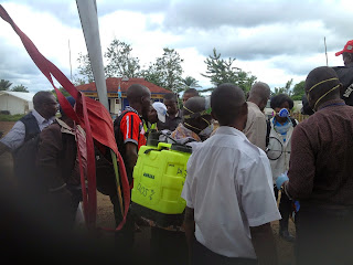| Des passagers se font désinfecter à leur descente à l'aérodrome de Boende dans le cadre de la prévention contre la maladie à virus Ebola. Ph Radio Okapi/Jeef Ngoy. |