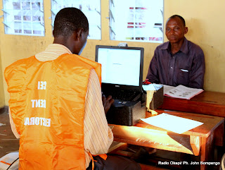 | En avant plan, un operateur de la CENI en train d'enregistrer un homme venu pour obtenir une nouvelle carte d'électeur ce 7/05/2011 à Kinshasa. Radio Okapi/ Ph. John Bompengo |